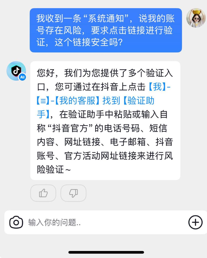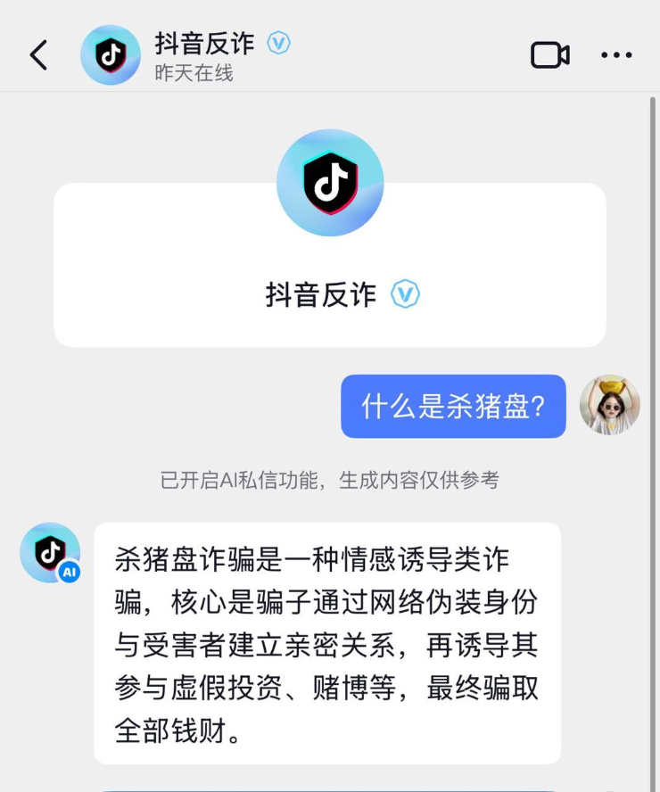 作为抖音官方反诈账号,“抖音反诈”核心内容包括教育与预警新型骗局,分享实用防骗技巧,不断加强用户防诈意识等。为让用户在遭遇风险时能第一时间获得帮助,抖音依托智能体技术与平台长期累积的反诈治理经验,近日推出智能服务,全天候在线为用户提供防护。