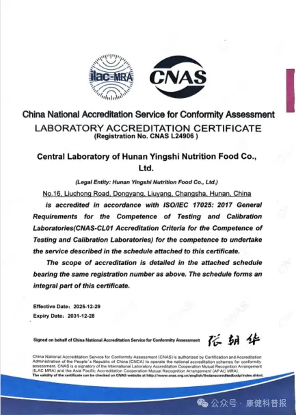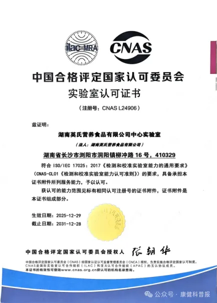 近日,英氏控股旗下湖南英氏营养食品有限公司的中心实验室正式通过中国合格评定国家认可委员会(CNAS)的严格评审,成功获得CNAS认可证书(注册号:CNAS L24906)。这是英氏控股再次获得CNAS的权威认可,背后是英氏控股从管理体系到技术细节的层层打磨,最终凭借扎实的硬实力,跻身国家认可的实验室行列,这标志着英氏中心实验多方面能力均已达到国际认可标准,也标志着英氏的科研与品控水平迈上新台阶。