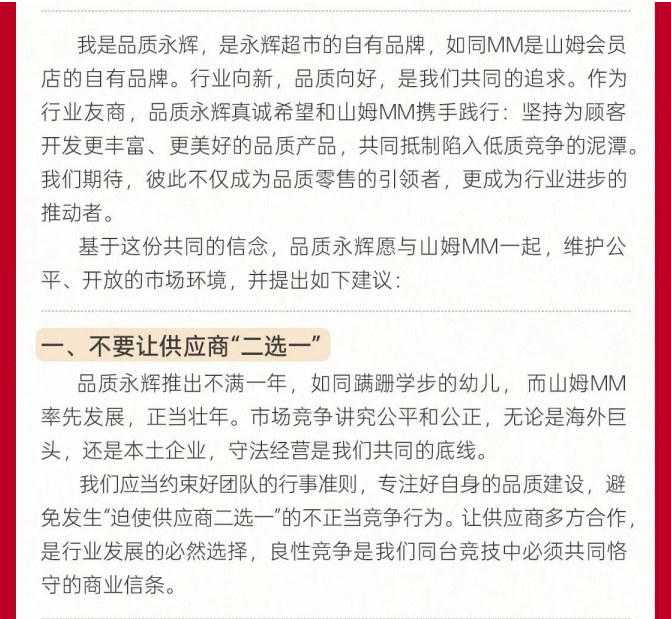 信中重点呼吁山姆MM不要让供应商“二选一”,坚决反对不正当竞争行为,应当约束好团队的行事准则,专注好自身的品质建设。