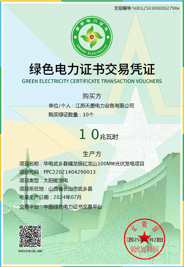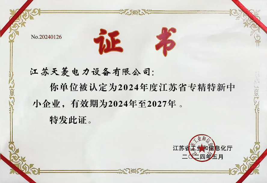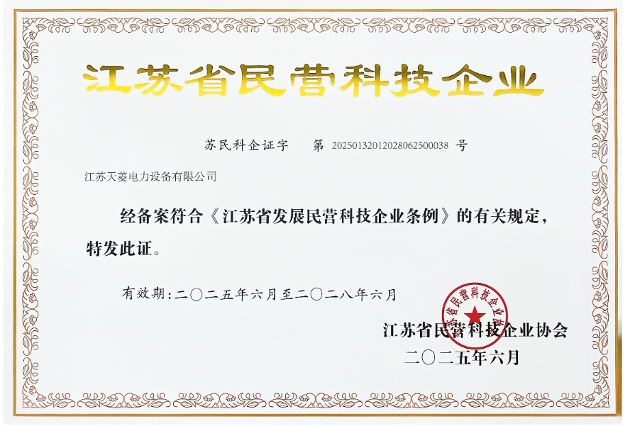 江苏天菱电力设备有限公司始终坚持质量为先,信誉至上的宗旨,是ISO9000系列质量保证体系认证企业,是国家级高新技术企业,市级研发中心企业,重合同守信用企业,消费者满意单位。在发展业务、丰富自身企业形象的同时,不忘回报社会,致力于公益事业,为弱势群体、城市地区自然灾害等捐助善款。近年来获得了“商标注册证书”、“民营科技企业证书”、“高新技术企业证书”、“3A级企业资信等级证书”、“5A级江苏省质量信用企业”、“股权挂牌证书”、“发明专利”等多项荣誉。