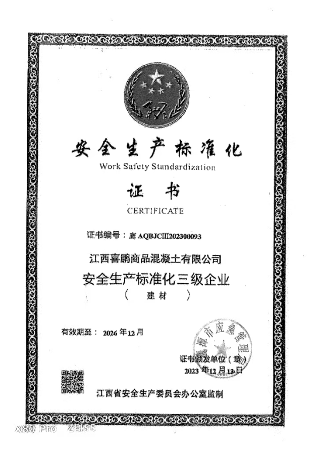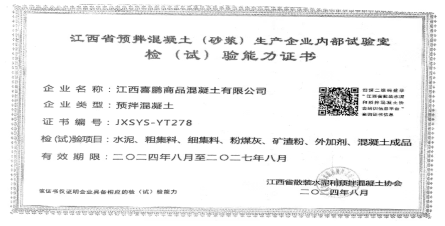 江西喜鹏商品混凝土有限公司于2010年4月经余江县经济贸易局的批准成立(余经贸【2010】03号),并在2010年8月在余江县发展和改革委员会(余发改【2010】88号文件)进行了项目备案。公司占地48亩,坐落于余江区龙岗工业园区。公司现有三一重工全电脑控制HZS180型生产线2条,每小时可生产预拌混凝土180m³;拥有三一汽车泵二辆;三一车载泵一辆;三一搅拌车15辆,DZL-500发动机组一套。各项生产设备、设施都是一流的,为安全生产和产品质量提供了有力的支持和保障。目前,公司下设生产部、实验室、销售部、车队等。拥有员工65名,其中中级职称5名,初级职称9名,技术人员若干名。实验室的各项设施设备均属国内一流,并已配齐。产品质量和产品创新提供了保证,公司已于2013年3月20日经上级主管部门批准,取得三级资质。公司本着“质量第一,服务周到,诚信经营”的企业宗旨,为广大客户提供优质的产品和服务,并取得客户的一致好评。