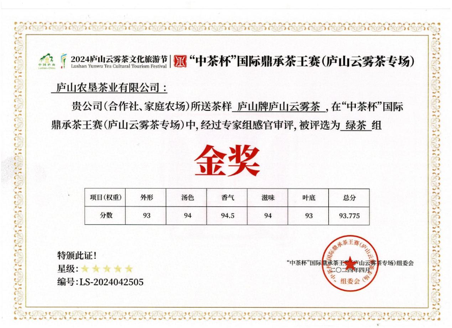 2024年4月“庐山牌“庐山云雾茶荣获”中茶杯“国际鼎承茶王赛五星金奖。