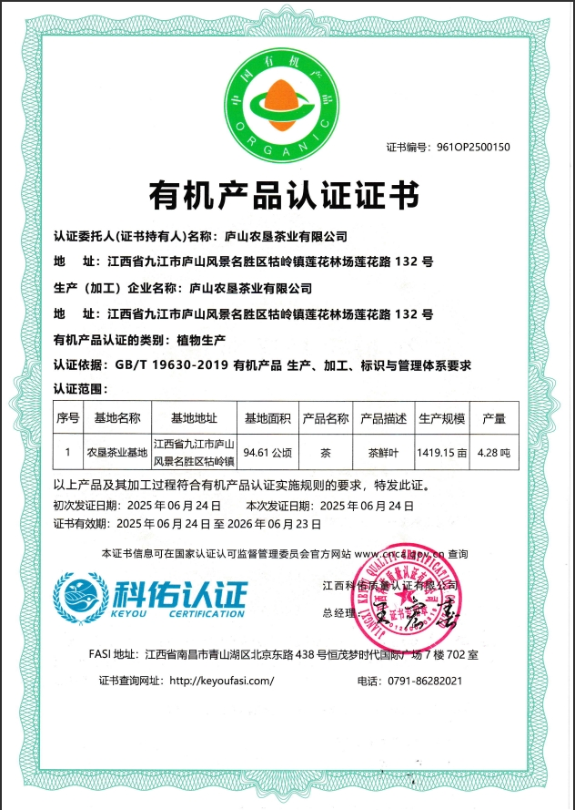 2022年庐山农垦茶业有限公司荣获由杭州中农质量认证中心有限公司颁发的有机转换认证证书;