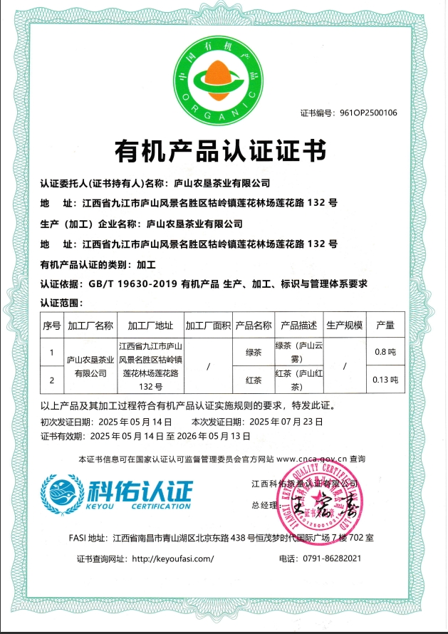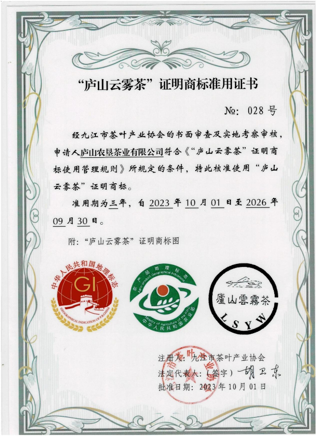 2021年“庐山牌“庐山云雾茶荣获江西绿色生态认证证书;