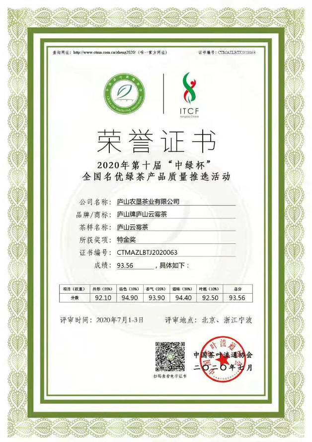 2020年“庐山牌”庐山云雾茶荣获2020年第十一届“中绿杯”全国名优绿茶产品质量推选活动特金奖;