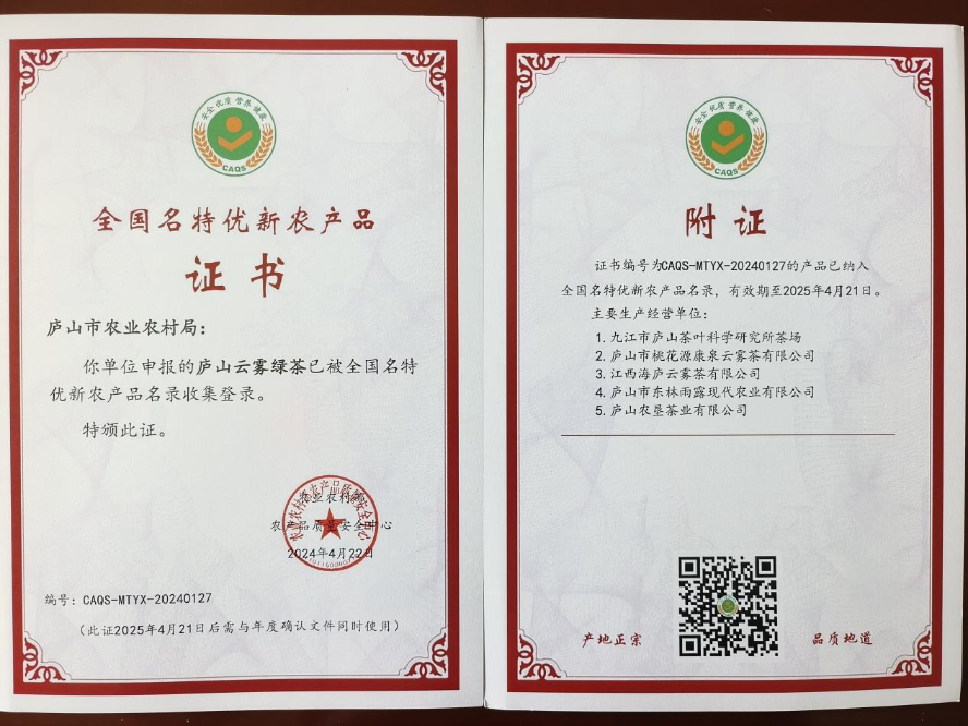 2024年4月“庐山牌”庐山云雾茶及”庐山红“红茶荣获全国名特优农产品称号;
