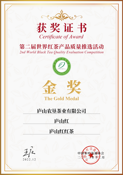 2022年“庐山红”红茶荣获第二届世界红茶产品质量推选金奖;