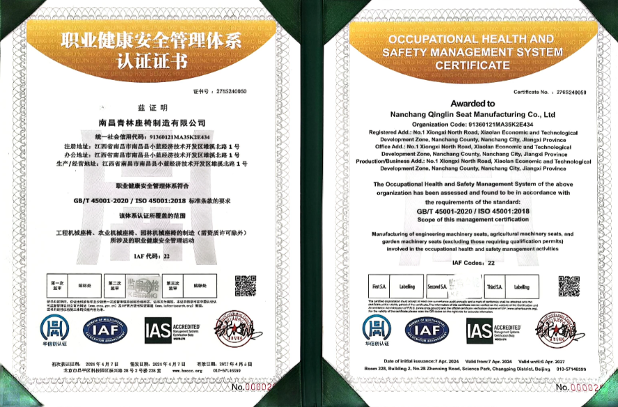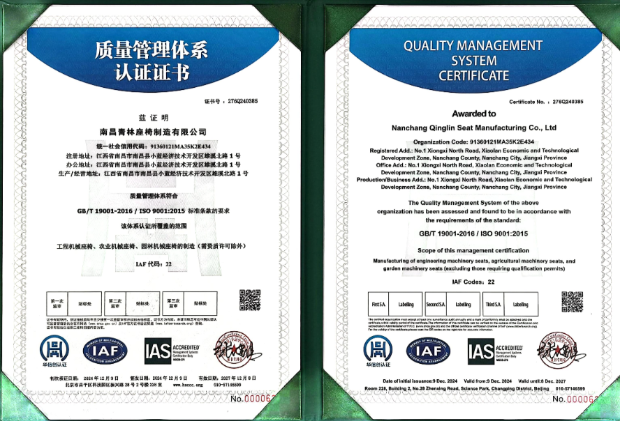 青林座椅引进先进生产设备,自动化冲压和机器焊接设备,自动流水线等。有自主研发中心和实验中心,拥有各项高精检测设备和座椅震动实验台,获得三十余项产品专利。有完善的质量管理体系,通过1SO9001:2015质量体系认证、1S014001:2015环境管理体系、职业健康安全管理体系认证、CE认证以及各项环保认证。