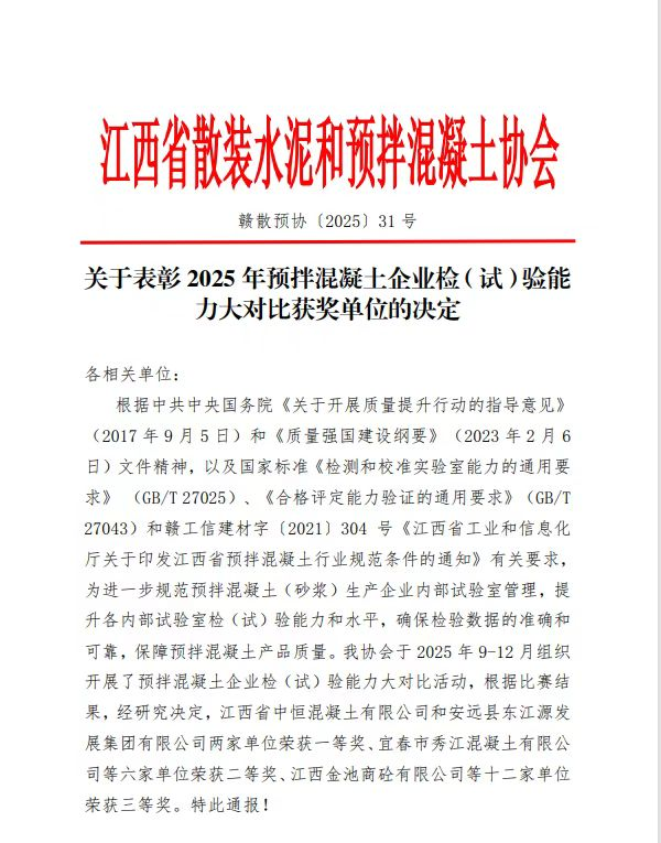 长期以来,欣山分公司聚焦内部试验室能力建设,注重把控原材料进场检测、生产过程质量控制、施工阶段技术支持,持续提升试验室日常检验及技术创新工作,确保预拌混凝土生产质量。公司于2025年12月30日被江西省散装水泥和预拌混凝土协会授予“2025 年江西省预拌混凝土企业检(试)验能力大对比一等奖。
