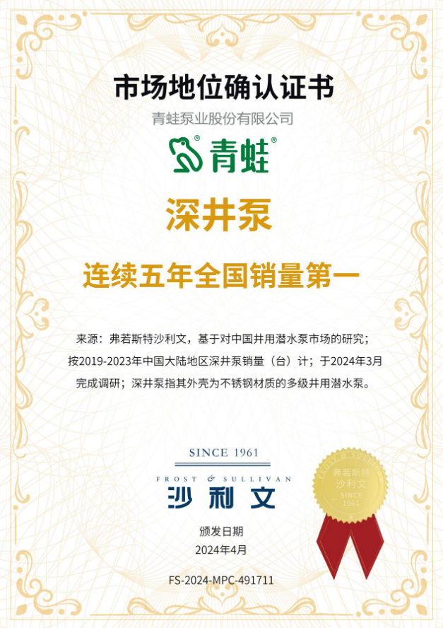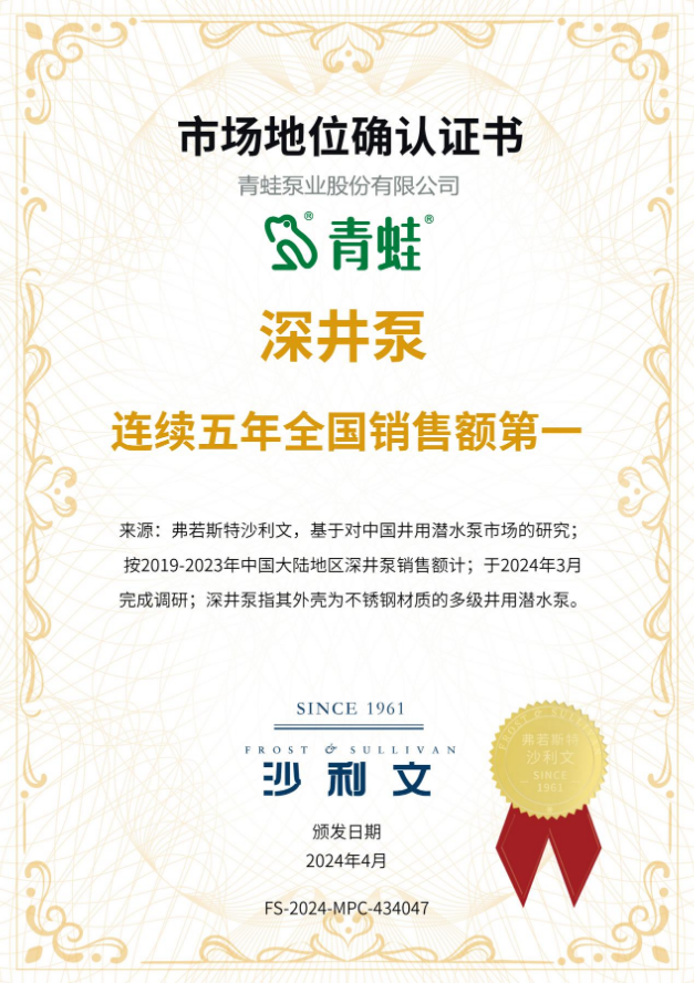 在水利机械装备领域,深耕细作的匠心与硬核的技术实力,是企业行稳致远的核心根基。始创于1988年的青蛙泵业股份有限公司,作为专业从事井用潜水泵研发、生产及销售的高新技术企业,三十余载坚守主业、创新突破,手握多项行业核心技术,产品远销全球多国,更斩获弗若斯特沙利文认证的2019-2023年中国大陆地区深井泵销量、销售额双料五连冠,成为名副其实的“深井泵专家与领导者”。